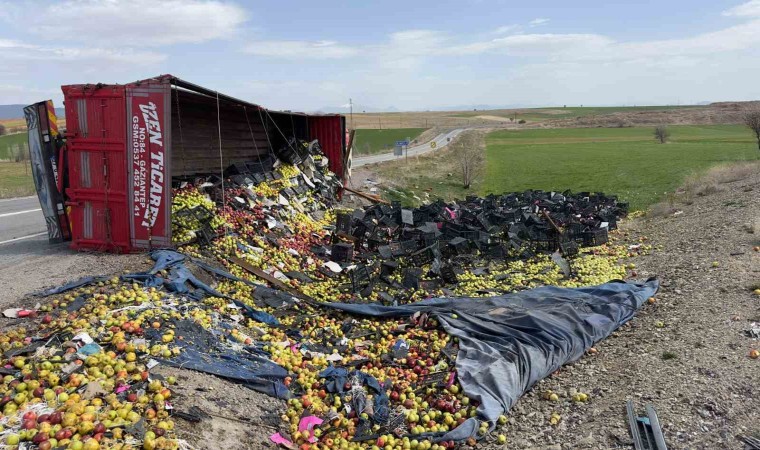 Konya’nın Hüyük ilçesinde elma yüklü kamyonun devrilmesi sonucu 2 kişi yaralanırken, tonlarca elma etrafa saçıldı.