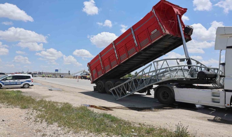 Konya’da seyir halindeyken damperi açılan tırın Elektronik Denetleme Sistemi (EDS) kameralarının bulunduğu direğe çarpması sonucu direk karşı şeritten gelen minibüsün üzerine devrildi. Kontrolden çıkarak şarampole giren minibüs sürücüsü olay yerinde hayatını kaybetti.