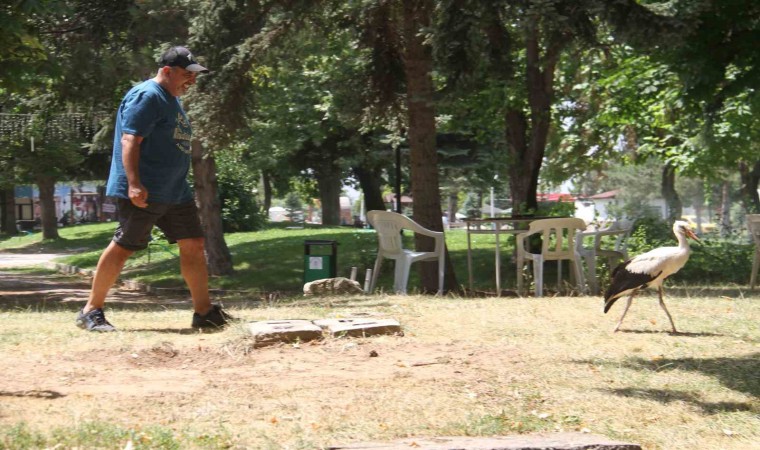 Konya’nın Beyşehir ilçesinde göl kenarındaki parkta insanların arasında kaçmadan gezen yavru leylek görenlerin ilgisiyle karşılaşıyor.