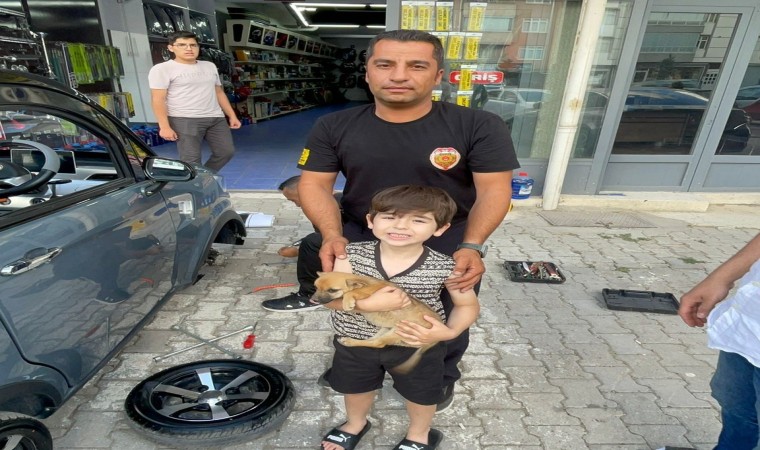 İtfaiye ekibinin çalışması ile yavru köpeğin sıkıştığı yerden çıkarılması ve küçük çocuğun sevinci ise cep telefonu kamerasına yansıdı.