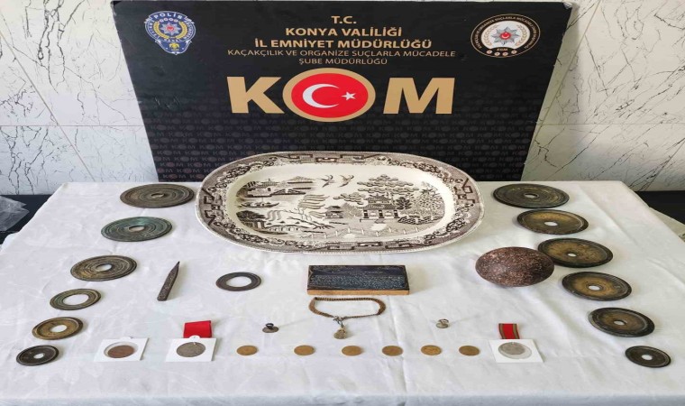 Konya’da polisin 3 adresi düzenlediği operasyonlarda çok sayıda sikke ve tarihi obje ele geçirildi.