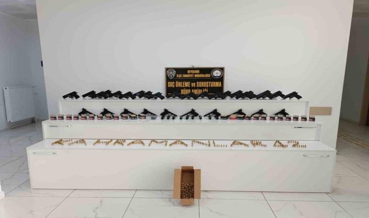 Edinilen bilgiye göre, Beyşehir’de ruhsatsız silah üretimi ve ticareti yapıldığı tespit edilen 5 ayrı adrese Konya İl Emniyet Müdürlüğü Beyşehir İlçe Emniyet Müdürlüğü Suç Önleme ve Soruşturma Bürosu Amirliği ekiplerince eş zamanlı operasyon düzenlendi. Arama yapılan adreslerde çok sayıda ruhsatsız silah ve silah parçaları ve tabanca mermileri geçirilirken, 7 adet suç kaydı olan Y.V. (44) ekiplerce yakalanarak gözaltına alındı. Tespit edilen 5 ayrı adresten Gündoğdu Mahallesi’ndeki bir evin garaj ve ağıl olarak kullanılan bölümünde, fasulye saplarının altında bulunan çorapların içerisine gizlenmiş vaziyette marka ve seri numarası olmayan 21 adet şarjörü takılı tabanca, 10 adet tabanca gövdesi, 64 adet tabanca imaline yarayan muhtelif silah parçası ve bin 841 adet tabanca mermisi ele geçirildi.