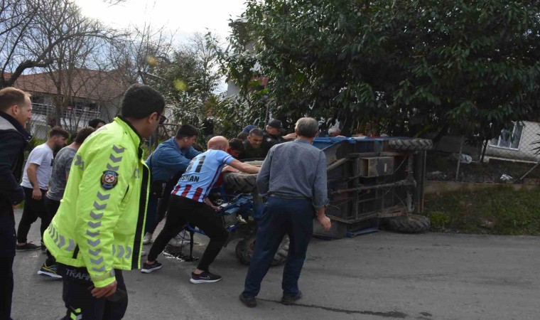 Sakarya’nın Hendek ilçesinde patpat diye tabir edilen tarım aracı, sürücüsünün köpeğe çarpmamak için manevra yapması neticesinde yan yattı. Meydana gelen kazada 2 kişi yaralandı.