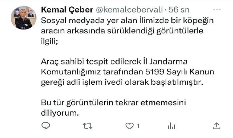 Gaziantep Valisi Kemal Çeber, olaya ilişkin, sosyal medya hesabından açıklama yaptı. Vali Çeber, araç sahibi hakkında adli işlem başlatıldığını duyurduğu paylaşımında, "Sosyal medyada yer alan ilimizde bir köpeğin aracın arkasında sürüklendiği görüntülerle ilgili; araç sahibi tespit edilerek İl Jandarma Komutanlığımız tarafından 5199 Sayılı Kanun gereği adli işlem ivedi olarak başlatılmıştır. Bu tür görüntülerin tekrar etmemesini diliyorum" ifadelerini kullandı. (DHA)