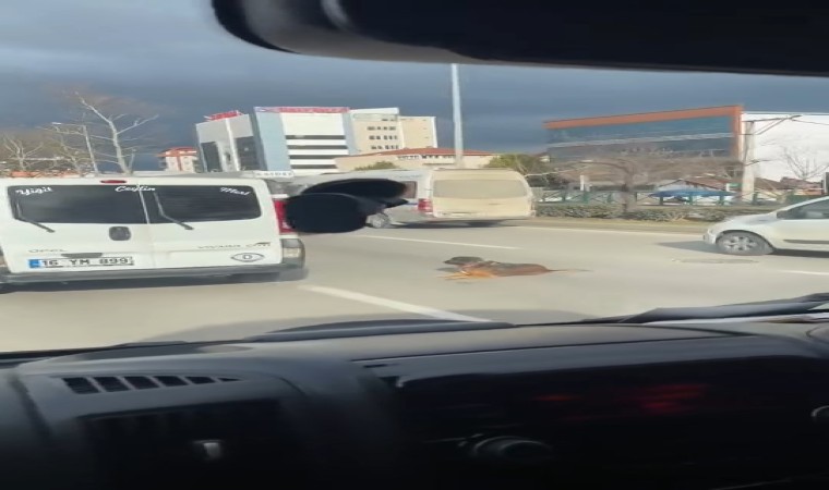 Bursa’nın en işlek caddelerinden biri olan merkez Osmangazi ilçesinde Sanayi Caddesi (Mudanya yolu) 2. kilometresinde yola çıkan köpek, 3 şeritli yolun ortasına oturdu. Araç trafiğinin yoğun olduğu caddede, köpeğin orta şeridi kapattığı gören sürücüler, sağından ve solundan geçmeye çalıştı. Uzun kuyruk oluşan yolda, bir sürücü ise köpeği yoldan kaldırmak için durdu.