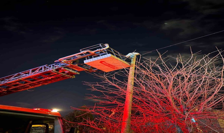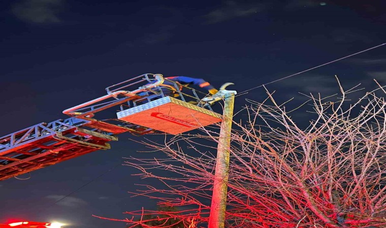 Van’ın Tuşba ilçesine sokak köpeklerinden kaçarken çıktığı direkte mahsur kalan kedi, itfaiye ekipleri tarafından kurtarıldı.