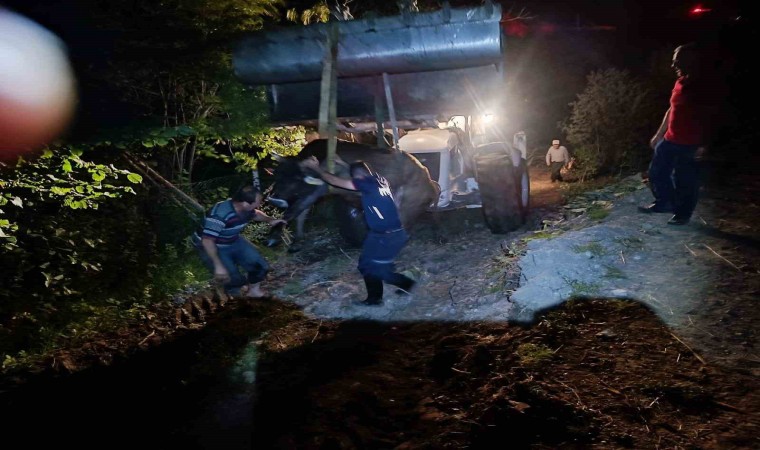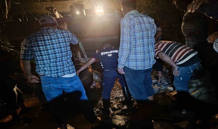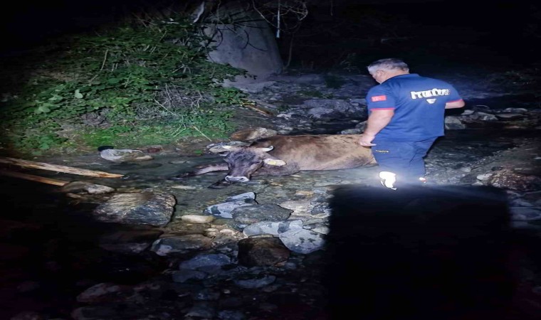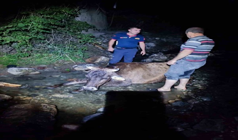 Olay, ilçeye bağlı Elmalı köyünde meydana geldi. Edinilen bilgiye göre, Şükrü Kaya’ya ait inek araziden dönerken ayağının kayması neticesinde köprüden dereye düştü. İneği kurtarmak için çalışan köy sakinleri, çabalarında başarılı olamayınca 112 Acil Çağrı Merkezini arayarak istedi.