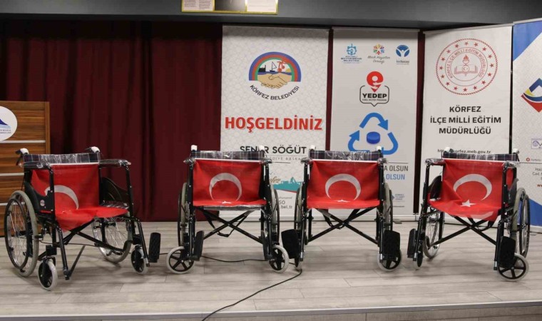 Körfez’de sıfır atık çalışmaları çerçevesinde okullarda 2 ay gibi kısa sürede 2 ton mavi kapak toplandı. Toplanan kapakların mutluluğa dönüştüğü proje çerçevesinde 4 tekerlekli sandalye alındı.