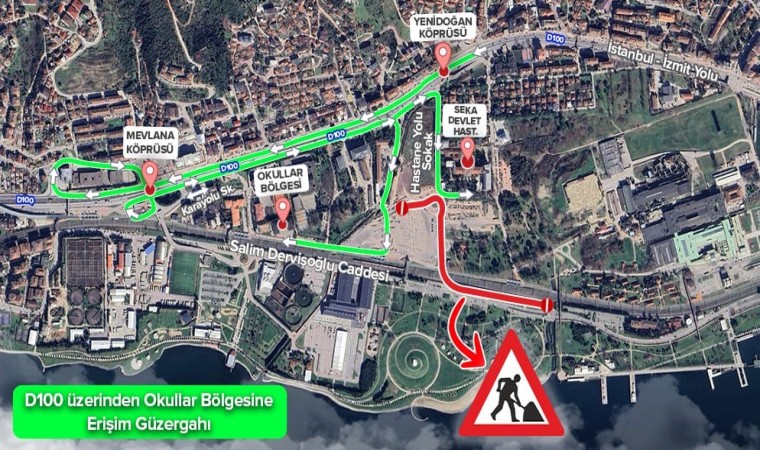 İzmit yönünden D-100 Karayolu’nu kullanan vatandaşlar Mevlana Köprüsü’nden dönüş yaparak Ulaşım Dairesi Başkanlığı önündeki yola bağlanıp, İstanbul yönünden gelen vatandaşlar da D-100 Karayolu’ndan Ulaşım Dairesi Başkanlığı’nın önündeki yolu kullanarak Okullar Bölgesi’ne ulaşabilecek. Salim Dervişoğlu Caddesi (Sekapark sahil yolu) üzerinden gelen vatandaşlar ise Maide Kavşağı üzerinden Mevlana Köprüsü’nü kullanarak Karayolu Sokak veya Ulaşım Dairesi Başkanlığı önündeki yolu kullanarak okullar bölgesine ulaşabilecek. Salim Dervişoğlu Caddesi üzerinden gelen vatandaşlar, Mevlana Köprüsü’nden D-100 Karayolu’na çıkıp Hastane Yolu Sokak’ı kullanarak hastaneye ulaşabilecek. Diğer erişim yönlerinden gelenler için bir değişiklik olmadığı belirtildi.