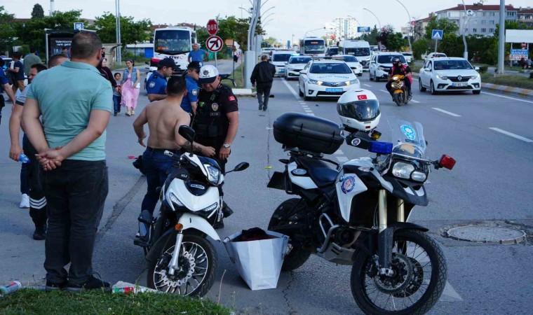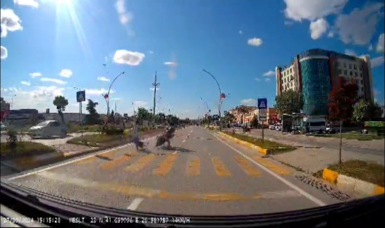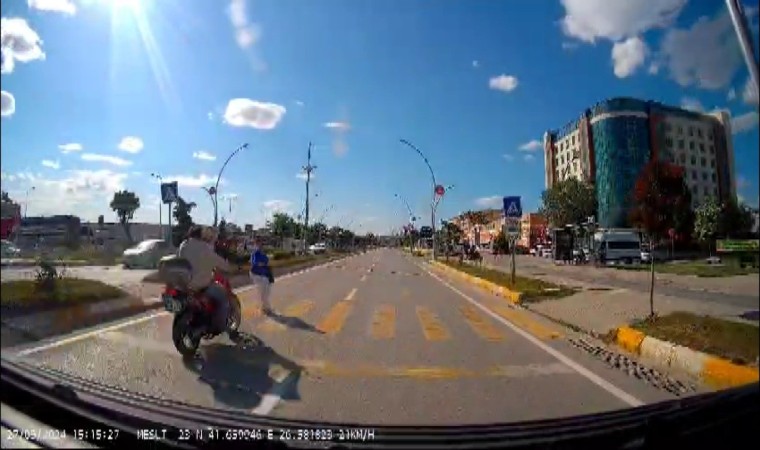 Edirne’de yaya geçidinden geçerken motosikletin çarptığı yaşlı kadının 18 metre sürüklenerek hayatını kaybettiği kaza araç kamerasına yansıdı.