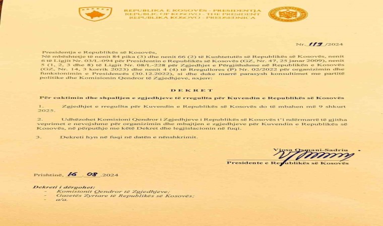 Kosova’da genel seçimlerin yapılacağı tarih belli oldu. Kosova Cumhurbaşkanı Vjosa Osmani sosyal medya hesabından yaptığı paylaşımda, siyasi partiler ve Merkez Seçim Komisyonu ile yapılan istişarelerin ardından genel seçimlerin 9 Şubat 2025’te düzenleneceğini ifade etti.