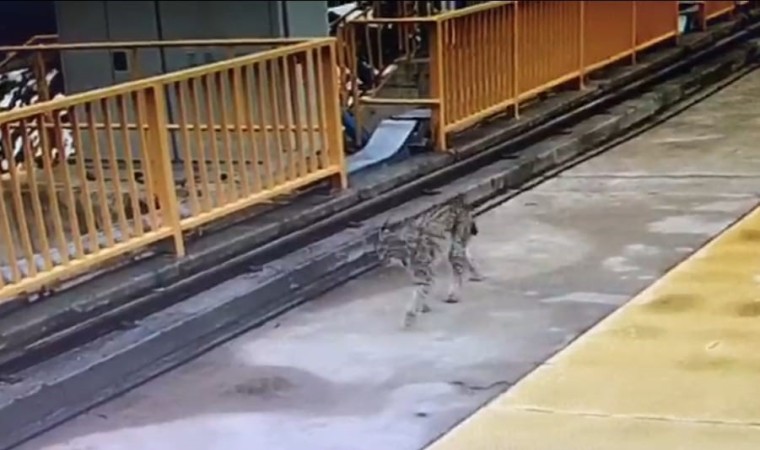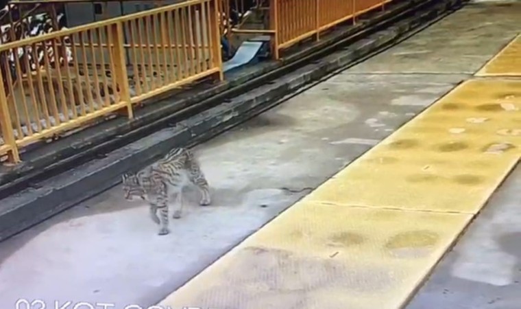 Güvenlik kamerasına yansıyan görüntülerde vaşak, baraj alanında ilerleyerek gözlerden kayboluyor.