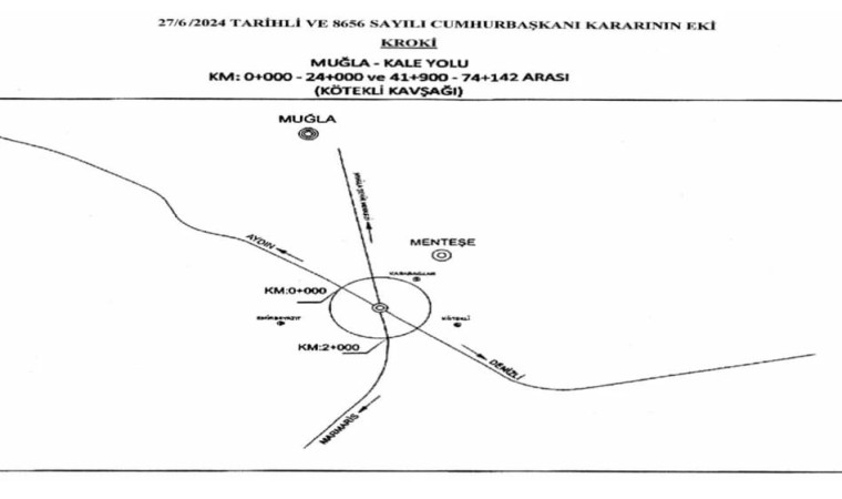 Resmi Gazetede yayımlanan Cumhurbaşkanlığı kararında, “Muğla-Kale Yolu Km:0+000-24+000 ve Km:41+900-74+142 arası toprak tesviye, sanat yapıları, köprü, üstyapı ve BSK işi kapsamında, Km:0+000’da bulunan ve farklı seviyeli kavşak olacak şekilde planlanan Kötekli Kavşağı’nın yapımı amacıyla, ekli krokide gösterilen proje güzergâhına rastlayan kesimde ihtiyaç duyulan Muğla ili, Menteşe ilçesi, Karabağlar, Emirbeyazıt ve Kötekli mahalleleri sınırları içerisindeki taşınmazlar ile üzerlerindeki müştemilatın Karayolları Genel Müdürlüğü tarafından acele kamulaştırılmasına, 2942 sayılı Kamulaştırma Kanununun 27’nci maddesi gereğince karar verilmiştir” denildi.