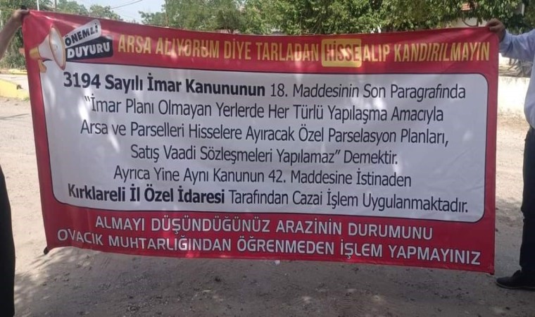Muhtar Tokatlı’nın konu ile açtığı pankartta, “Arsa alıyorum diye, tarladan hisse alıp kandırılmayın. 3194 sayılı İmar Kanunun 18. maddesinin son paragrafında ’imar planı olmayan yerlerde her türlü yapılaşma amacıyla arsa ve parselleri hisselere ayıracak özel parselasyon planları, satış vaadi sözleşmeleri yapılamaz’ denilmektedir. Ayrıca yine aynı kanunun 42. maddesine istinaden Kırklareli İl Özel İdaresi tarafından cezai işlem uygulanmaktadır. Almayı düşündüğünüz arazinin durumunu Ovacık Muhtarlığından öğrenmeden işlem yapmayınız” ifadelerine yer verildi.