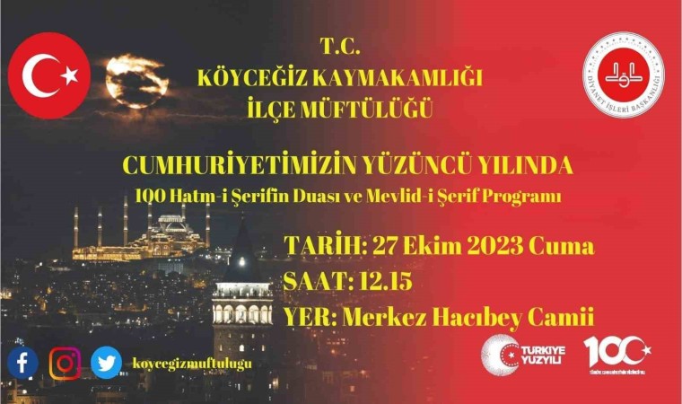 Muğla’nın Köyceğiz ilçesinde Cumhuriyetin 100. Yılında 100 Hatm-i Şerifin Duası ve Mevlid-i Şerif programı gerçekleştirilecek.