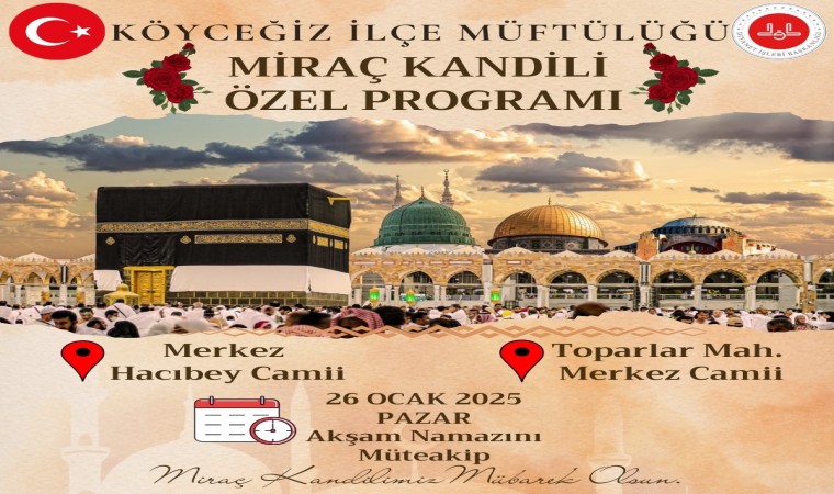 Ayrıca Müftü Karagöz, "26 Ocak 2025 Pazar günü gündüz Zeytinalanı Merkez Camii ile Beyobası Merkez Camiinde bayanlara yönelik, akşam namazından sonra da Köyceğiz’deki tüm camilerimizde olduğu gibi Merkez Hacıbey Camii ve Toparlar Mahallesi Merkez Camiinde Kandil özel programımız olacaktır. Programlarımıza tüm halkımızı davet eder, bu duygu ve düşüncelerle Köyceğizli kardeşlerimizin, misafirlerimizin ve tüm inananların; dileklerin dalga dalga Cenab-ı Allah’a ulaştığı, dökülen pişmanlık gözyaşlarının günahları silip yok ettiği Miraç kandillerini tebrik eder, yapacağımız dua ve niyazların kabul görmesini, İslam Aleminin, birlik ve beraberliğine, Aziz Milletimizin ve bütün insanlığın barış, huzur ve saadetine vesile olmasını Yüce Allah’tan temenni ve niyaz ederim" ifadelerini kullandı.