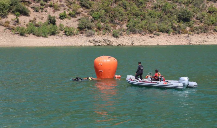Su seviyesi düşürülen baraj gölünde, dün yaklaşık 35-40 metre derinlikte bir kısmı balçıkta olan helikopteri kaldırma balonlarıyla 15 metre derinliğe çıkaran ekipler, çalışmalarını sürdürdü.