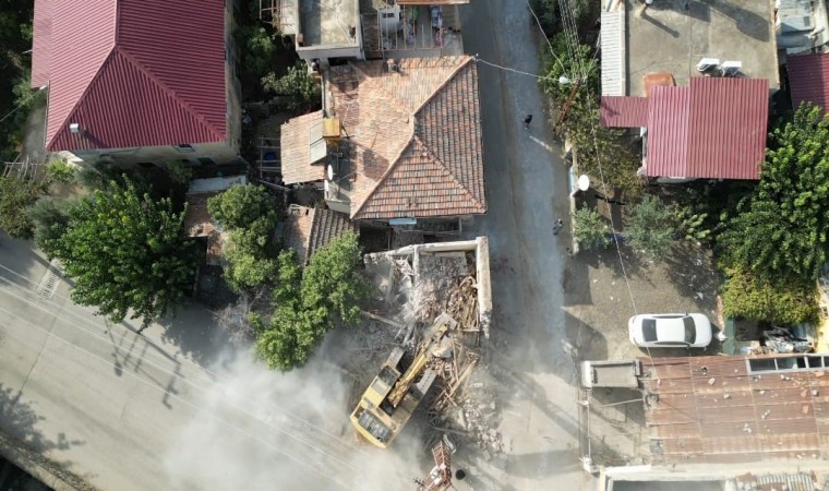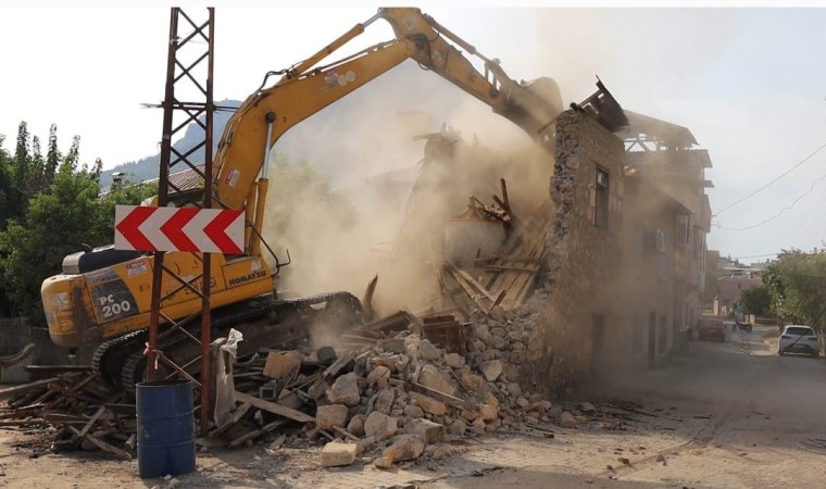 Belediye ekiplerinin çevresinde önlem aldığı Tufanpaşa ve Hamam mahallelerinde bulunan ağır hasarlı 3 bina iş makineleriyle kontrollü yıkıldı.
