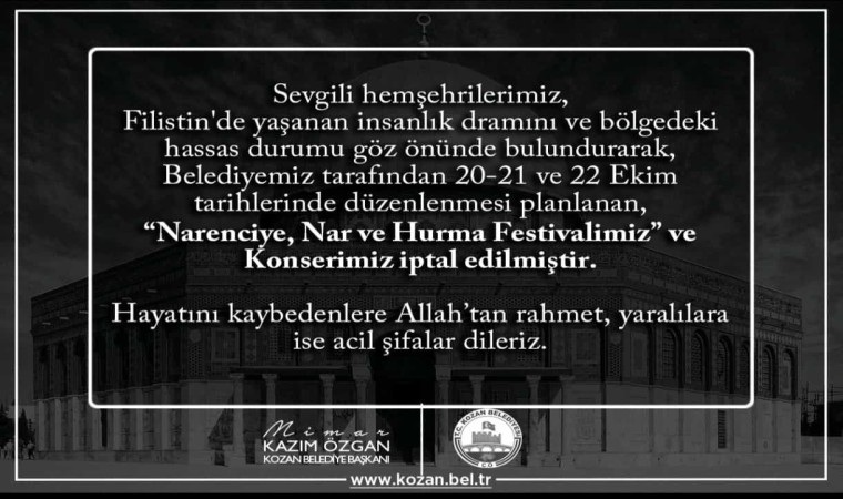 Kozan Belediye Başkanlığı tarafından yapılan yazılı açıklamada, “Sevgili hemşehrilerimiz, Filistin’de yaşanan insanlık dramını ve bölgedeki hassas durumu göz önünde bulundurarak, Belediyemiz tarafından 20-21 ve 22 Ekim tarihlerinde düzenlenmesi planlanan, “Narenciye, Nar ve Hurma Festivali” ve konserimiz iptal edilmiştir. Hayatını kaybedenlere Allah’tan rahmet, yaralılara ise acil şifalar dileriz” denildi.
