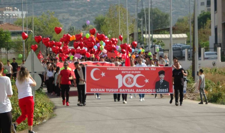 Kozan Yusuf Baysal Anadolu Lisesi okulu öğrencileri bayrak yürüyüşü düzenleyerek ellerinde taşıdıkları yüzlerce kırmızı balonu bilim parkında gökyüzüne bıraktı.