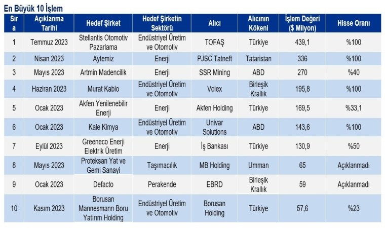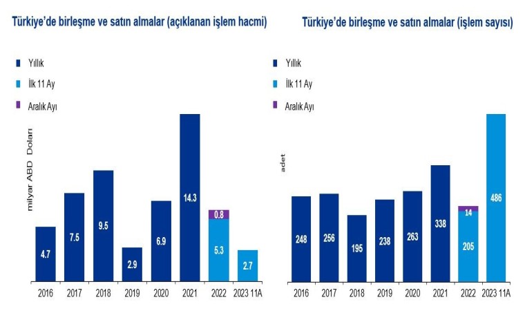 Açıklanan bilgilere göre; 2023 yılında Türkiye’deki birleşme ve satın alma işlemlerinin genel görünümü Kasım ayı sonu itibarıyla toplam işlem adedi bazında geçen yılın ilk 11 ayında 205 olurken bu yıl aynı dönemde 486’ye ulaştı. Açıklanan işlem hacmi 2,7 milyar dolar ile geçen yılın altında kalmış olsa da değeri açıklanmayan işlemlerin şirket tarafından yapılan tahminler ve değerlendirmeler sonucunda 7,3 milyar dolara ulaştığı ve böylece geçen seneyi de geride bıraktığı tahmin ediliyor.