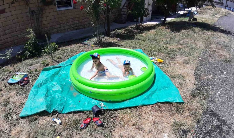 Bolu’nun Mudurnu ilçesine bağlı Yazılar köyünde sıcaklardan bunalan çocuklar ailesinin yardımıyla bahçeye kurulan havuzda serinledi. Ülker ailesinin çocukları 3 yaşındaki Ege ve 4 yaşındaki Rüzgâr, küçük havuzda eğlenceli vakit geçirdi. Doyasıya eğlenen ve serinlemenin keyfini çıkaran çocuklar birbirleriyle su savaşı yaptı.