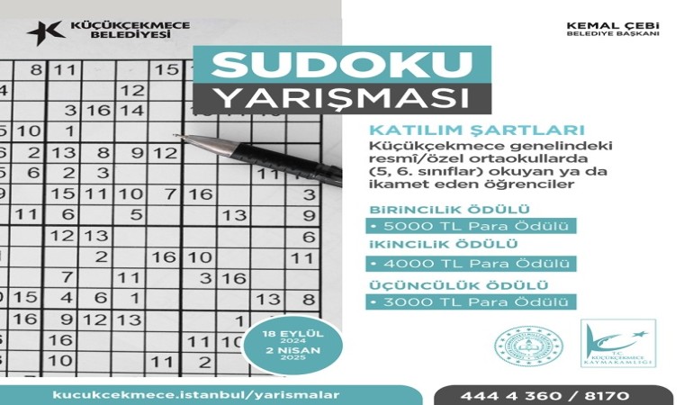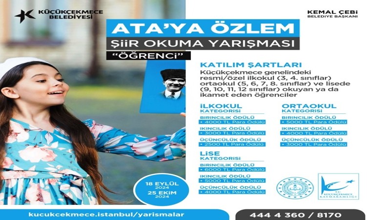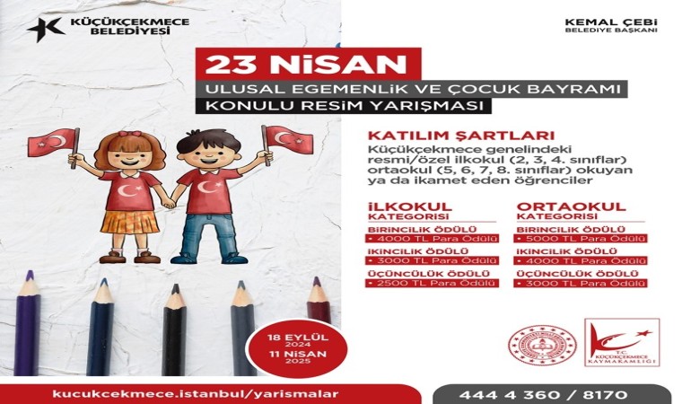 Alanında uzman akademisyenlerin jürilik yapacağı yarışmalarda dereceye girenlere Küçükçekmece Belediyesi tarafından 2 bin 500 TL ile 7 bin 500 TL arasında para ödülü verilecek. Yarışmalar; ‘’Ata’ya Özlem’’ konulu şiir okuma yarışması, ‘’Yap Boz’’ hız yarışması, ‘’Mangala’’ turnuvası, ‘’Sudoku’’ yarışması ve ‘’23 Nisan Ulusal Egemenlik ve Çocuk Bayramı’’ konulu resim yarışması olmak üzere altı kategoride gerçekleştirilecek. Gençlik ve Spor Müdürlüğü tarafından düzenlenen ödüllü yarışmalara öğretmenler de başvurabilecek.