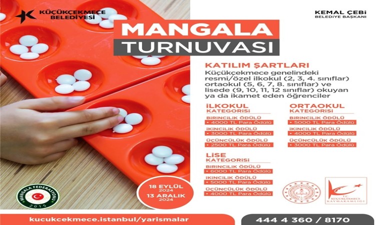 Küçükçekmece Kaymakamlığı, İlçe Milli Eğitim Müdürlüğü ve Mangala Federasyonu işbirliği ile gerçekleştirilen ödüllü yarışmalara, Küçükçekmece’de ikamet eden resmi ya da özel ilkokul, ortaokul ve lise öğrencilerinin yanı sıra öğretmenlerde katılım sağlayabilecek.