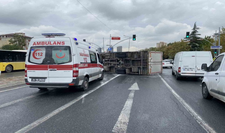 Küçükçekmece’de, yağış nedeniyle kayganlaşan yolda seyir halindeki kamyon kontrolden çıkarak devrildi.