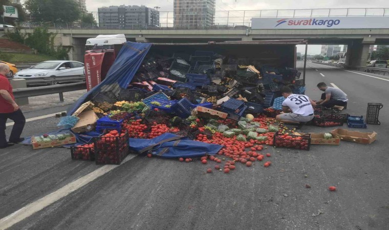 Küçükçekmecede sebze yüklü kamyon devrildi: Yüzlerce kilo sebze yola savruldu
