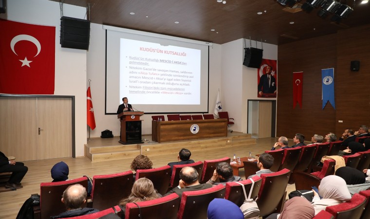 PAÜ İlahiyat Fakültesi Öğretim Üyesi Doç. Dr. Osman Aydınlı da ‘Kudüs’ün Önemi ve Filistin Gerçeği’ başlıklı konuşmasında, “Bugün Kudüs’ü konuşalım ve neler yaşanıyor bunlar üzerinde duralım dedim. Bugüne kadar yaptığımız her konferansta dile getirdiğimiz bir konu ama gücümüz yettikçe, 3 konu üzerinde ve en öz şekilde bahsetmeye çalışacağım. Önce ne oluyor neden binlerce yıldır burada kan gözyaşı ve büyük katliamlar yaşanıyor. Kudüs’ün Mescidi-i Aksa’nın değeri nedir? İkinci konu Filistin’de neler oluyor? Filistin gerçeği nedir? Bugün yaşanan olayların alt yapısında ne yatıyor? Yahudiler ne yapmak istiyor? Siyonist Hıristiyanların dertleri ne? Bunların üzerine yapılan birçok doktora tezleri var. Artık hiçbirinde inkâr etmiyorlar ki bunun da bilinmesini istiyorlar Üçüncüsü bugün ve tüm dünyada söz Yahudilerin. Büyük bir algı yalan ve iftirayla herkese aşılamak istediği şey Filistinlilerin kendi topraklarını sattığıdır. Yahudiler kendi öz paralarıyla helal paralarıyla bunları aldı. İptal edebilecek hiçbir toprak yoktur. Yalanı veya da algısı üzerinde son bilgileri bu konu üzerinde vermek istiyorum. Üç tane konuya dikkat çekmek istiyorum. Gazzeli gençlerimiz var onlar geleceklerdi belki geç kaldılar inşallah biraz sonra burada olurlar. Filistin toprakları çok verimli topraklar. Burası büyük ticaret yollarının geçtiği yerde değil burası cenabı Allah’ın ot bitmeyen Mekke gibi içinde ve çevresinde ot bitmeyen Mekke gibi aslında kente kutsal damgasını vurduğu topraktır. Binlerce yıldır nice krallar nice imparatorluklar burayı ele geçirmek için burada nice kanlar döktü, nice canlar acıttılar” dedi.