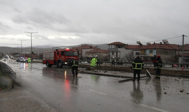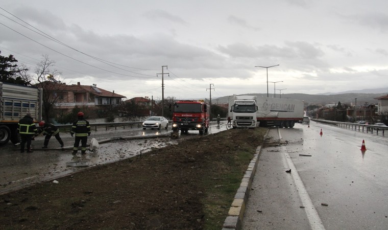 Manisa’nın Kula ilçesinde gece saatlerinden bu yana süren yağmur yağışının da etkisiyle kayganlaşan yolda kontrolden çıkan tır, orta refüjdeki aydınlatma direklerini devirdi. Kaza esnasında karayolunun her iki istikametinde araç bulunmaması büyük bir faciayı önledi.