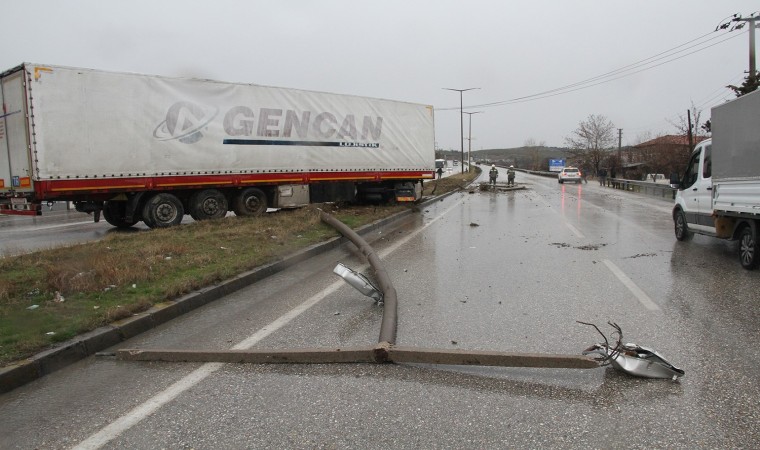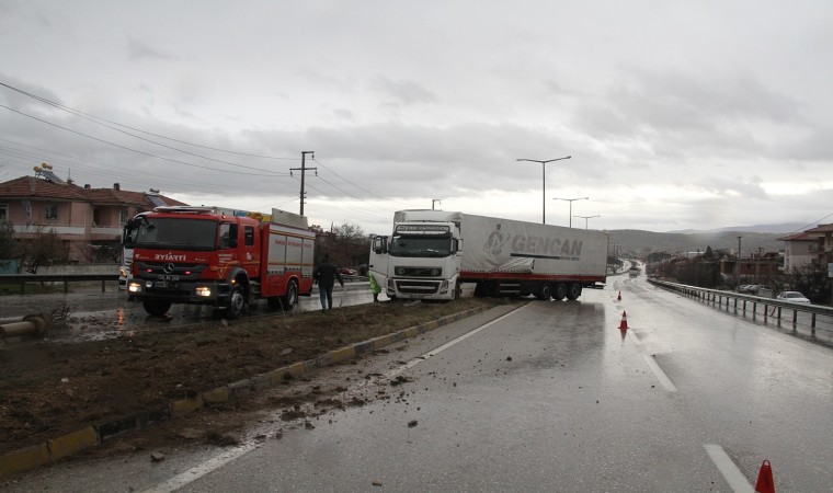 Kaza, saat 11.00 sıralarında İzmir-Ankara D300 karayolu Kavacık rampalarında meydana geldi. Edinilen bilgiye göre İzmir’den Uşak istikametine seyir halinde olan İnan Yaman (31) idaresindeki 61 K 12161 plakalı tır, geceden bu yana süren yağmur yağışının da etkisiyle kayganlaşan yolda sürücüsünün kontrolünden çıktı. Karayolunda savrulan tır, orta refüje çıkarak aydınlatma direklerini devirdi. Kaza esnasında karayolunun her iki istikametinde de araç bulunmaması büyük bir faciayı önlerken, tır sürücüsü de kazayı yara almadan atlattı.