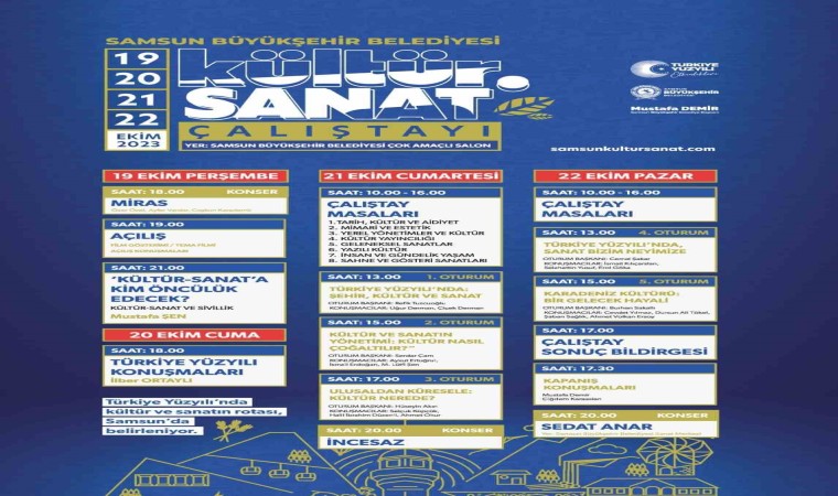 Çalıştayın, Türkiye’nin sanat ve kültür alanında önemli isimlerini Samsun’da bir araya getireceğini belirten Büyükşehir Belediye Başkanı Mustafa Demir, “Türkiye Yüzyılı’nda Kültür ve Sanatın Rotası Samsun’da Belirleniyor’ mottosuyla düzenlediğimiz bu organizasyonu kentimiz ve ülkemiz için çok önemsiyoruz. ‘Öncü Şehir Samsun’ vizyonuyla kentimizde dev bütçeli yatırımları hayata geçirirken bir yandan da kültür ve sanat alanında öncü organizasyonları düzenliyoruz. Büyükşehir Belediyesi olarak kültür ve sanat faaliyetlerine büyük önem veriyoruz. Sanat ve kültürün her zaman ön planda tutulduğu çalışmaları hayata geçiriyoruz. Kültür ve Sanat Çalıştayımız da bu kapsamda düzenlediğimiz çok önemli etkinliklerden birisi. Tüm vatandaşlarımızı bu değerli organizasyona katılmaya davet ediyorum” dedi.