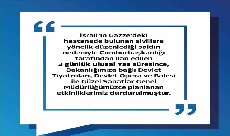 Kültür ve Turizm Bakanlığı, Gazze’deki sivillere yönelik düzenlenen saldırı nedeniyle Cumhurbaşkanlığı tarafından ilan edilecek olan 3 günlük ulusal yasa ilişkin açıklama yaptı. Bakanlık tarafından yapılan yazılı açıklamada, “İsrail’in Gazze’deki hastanede bulunan sivillere yönelik düzenlediği saldırı nedeniyle Cumhurbaşkanlığı tarafından ilan edilen 3 günlük Ulusal Yas süresince, Bakanlığımıza bağlı Devlet Tiyatroları, Devlet Opera ve Balesi ile Güzel Sanatlar Genel Müdürlüğümüzce planlanan etkinliklerimiz durdurulmuştur” denildi.