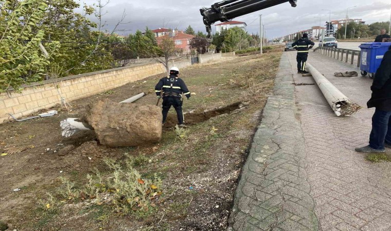 Konya’nın Kulu ilçesinde şiddetli rüzgar nedeniyle yol kenarında bulunan beton elektrik direği kırılarak devrildi. Şiddetli rüzgar daha sonra yerini sağanak yağmura bıraktı.