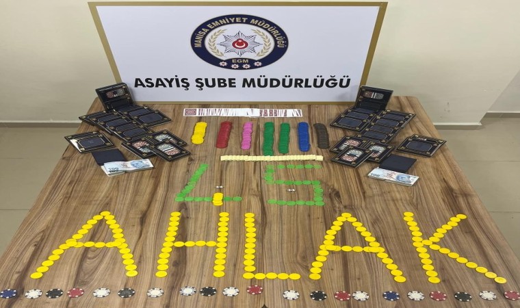 Manisa İl Emniyet Müdürlüğü Asayiş Şube Müdürlüğü Ahlak Büro Amirliği görevlilerince yapılan çalışmalarda Şehzadeler ilçesinde bir ikamette kumar oynandığı tespit edilmesi üzerine gece yarısı 00.30 sıralarında söz konusu adreste yapılan aramada, 70 deste iskambil kağıdı, 26 adet okey taşı, 404 adet pul, 4 adet zar, 400 TL para, 3 adet hesap defteri, 2 adet uyuşturucu hap ele geçirildi. Konuyla ilgili kumar oynadığı tespit edilen 6 şahsa Kabahatler Kanununun 34. maddesine göre 24 bin 330 TL idari para cezası uygulanırken, ev sahibi V. A. (30) isimli şahıs hakkında ’Kumar oynanması için yer ve imkan sağlama’ ve TCK 191 ’Kullanmak için uyuşturucu madde bulundurmak’ suçlarından adli işlemlere başlandığı bildirildi.