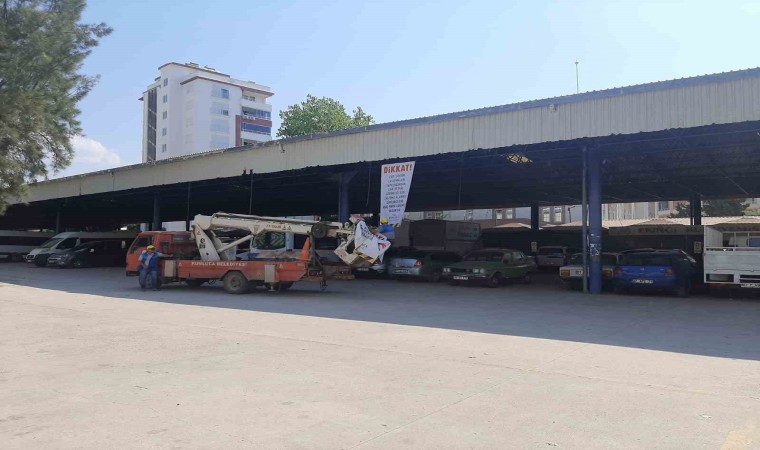 Eski Kapalı Halk Pazarı’na gelen belediye ekipleri tarafından önce "Dikkat çatı söküm çalışmaları yapıldığından can ve mal güvenliği için çalışma alanına girilmesi ve araç park edilmesi yasaktır" pankartları asıldı.