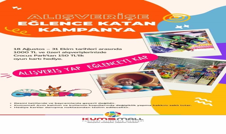 Türkiye ve Avrupa’nın en büyük karma AVM’si olan KUMSMALL AVM, alışverişe eğlence katan bir kampanya başlattı. Kampanya süresince belirlenen miktarda alışveriş yapanlar, Türkiye’nin en büyük kapalı oyun parkı olan Crocus Park’tan oyun kartı kazanacaklar.