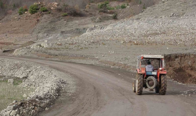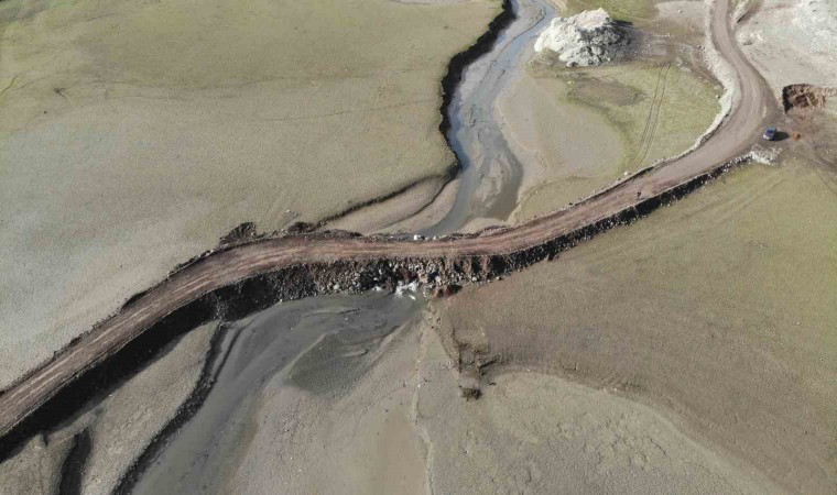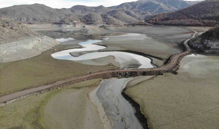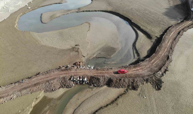 Tokat’ın Almus ilçesinde baraj suyunun çekilmesiyle 18 köye ulaşımı kısaltan stabilize yol ortaya çıktı.
