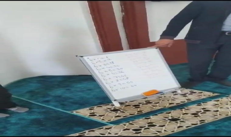 Ağrı’nın Taşlıçay ilçesine bağlı Aşağı Düzmeydan köyünde Yaz Kur’an kursuna giden öğrenciler burada aynı zamanda matematik dersi de görüyorlar.