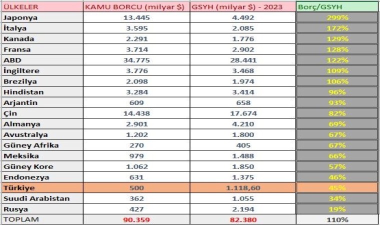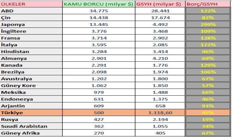 G20 ülkelerinin kamu borcu/GSYH oranı dikkate alındığında zirvede yüzde 299 ile Japonya yer aldı. Japonya’nın borcunu 3 yıl boyunca yaptığı üretimle borcunu ödeyebileceği anlaşıldı. Sıralamada İtalya yüzde 172 borç/GSYH oranıyla ikinci olurken Kanada yüzde 129 ile üçüncü oldu. Diğer ülkeler ise Fransa yüzde 128, ABD yüzde 122, İngiltere yüzde 109, Brezilya yüzde 106, Hindistan yüzde 96, Arjantin yüzde 93, Çin yüzde 82, Almanya yüzde 69, Avustralya yüzde 67, Güney Afrika yüzde 67, Meksika yüzde 66, Güney Kore yüzde 57, Endonezya yüzde 46, Türkiye yüzde 45, Suudi Arabistan yüzde 34, Rusya yüzde 19 olarak gerçekleşti.