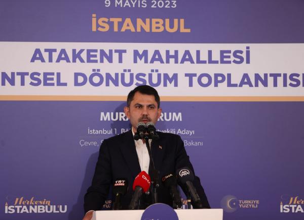 Bakan Kurum, “Atakent Mahallesi Ümraniye’mizin göz bebeği bir mahallemizdir. Fakat buradaki yapılar 1970’lerden kalma ömrünü tamamlamış, çok eski binalardır. Bu nedenle yapıların acilen dönüştürülmesi, siz kıymetli Ümraniyeli kardeşlerimizin bir an önce can güvenliğinin sağlanması şarttır. 772 bina ve 6 bin 124 konut ve iş yerinden oluşan 25 bin kardeşimizi ilgilendiren bu mahallemizde çok özel bir kentsel dönüşüm çalışması yürüteceğiz. Atakent Mahallemiz için de ‘Yarısı Bizden’ diyelim. Kentsel dönüşüme sokacağınız konutların maliyetinin yarısını devlet olarak biz karşılayalım. Kentsel dönüşüme evet dediğiniz andan itibaren hem taşınma hem de kira yardımlarından istifade etmenizi sağlayalım. Başlatacağımız bu çalışma İstanbul Finans Merkezi'ne de yakın olan bu mahallemizin değerine değer katacaktır” ifadelerini kullandı.