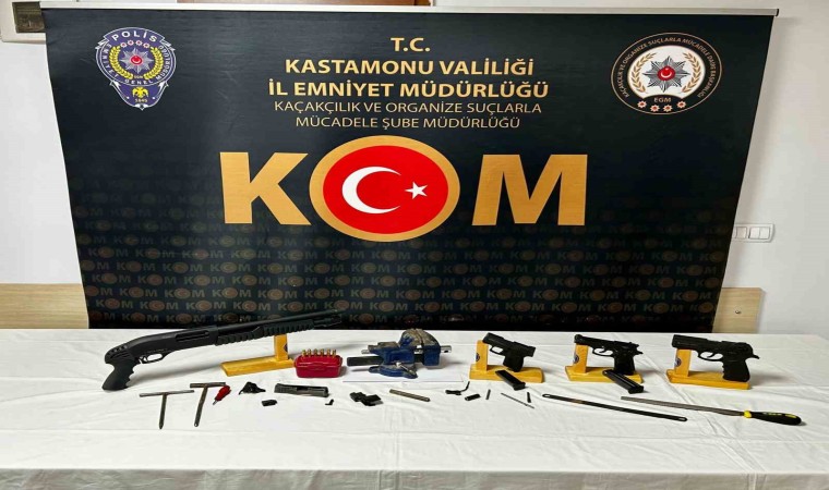 Edinilen bilgiye göre, Kastamonu İl Emniyet Müdürlüğü Kaçakçılık ve Organize Suçlarla Şube Müdürlüğü ekipleri tarafından ’silah ve mühimmat kaçakçılığı’na yönelik yapılan çalışmalar çerçevesinde, iki şahsın kurdukları atölyede kurusıkı tabancaların namlularını değiştirdiği tespit edildi. Harekete geçen ekipler tarafından şahıslara ait atölye ve ikamette arama yapıldı. Aramada 1 adet kurusıkıdan bozma ruhsatsız tabanca, 2 adet namlu değiştirme işlemi devam eden kurusıkı tabanca, 1 adet silah namlusu, silah parçaları, 1 adet ruhsatsız tüfek, 3 adet şarjör, 6 adet mermi, namlu değiştirmek için kullanılan aletler ele geçirildi.
