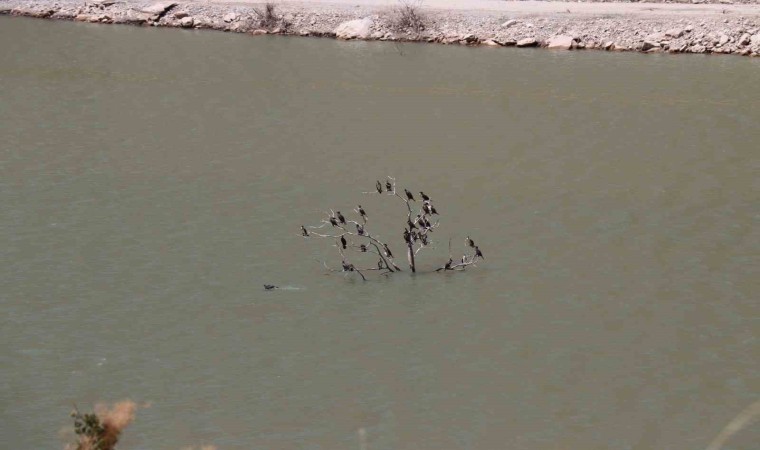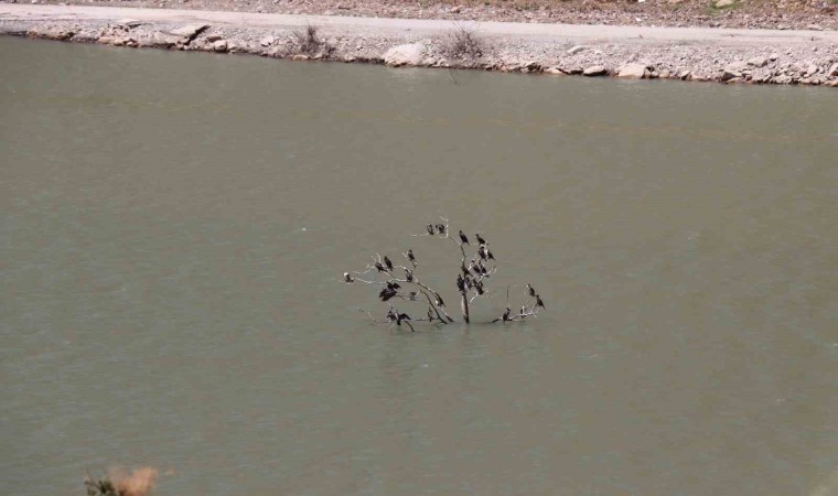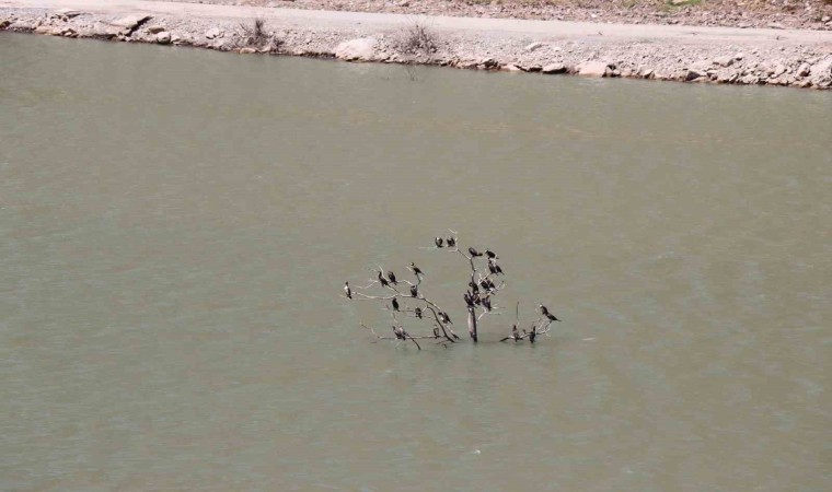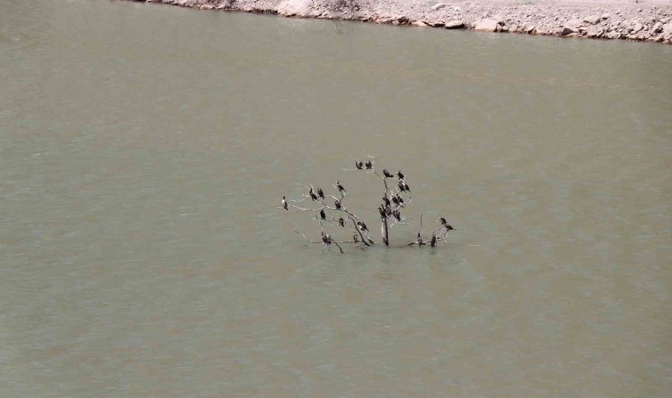 Su debisi düşen Oltu’nun Ayvalı Barajı’ndan ortaya çıkan kurumuş ağaç, karabatak kuşlarına adeta sığınak oldu.