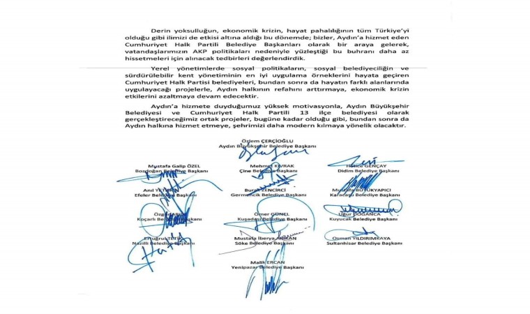 Aydın’da Büyükşehir Belediye Başkanı Özlem Çerçioğlu ve CHP’li 13 ilçe belediye başkanı, Türkiye’deki ekonomik krize bağlı olarak yaşanan hayat pahalılığı ve giderek düşen alım gücü karşısında Aydın halkının refahını artıracak projeleri görüşmek amacıyla bir araya geldi. Krizin etkilerini azaltmaya yönelik gerçekleştirilecek önlemlerin ele alındığı toplantı sonunda, CHP’li belediye başkanları ortak bir taahhütname hazırladı. Taahhütnameyi Kuşadası Belediye Başkanı Ömer Günel de imzaladı.