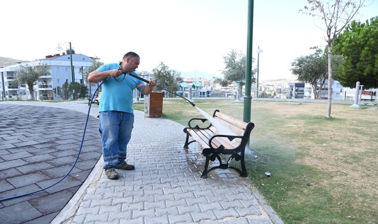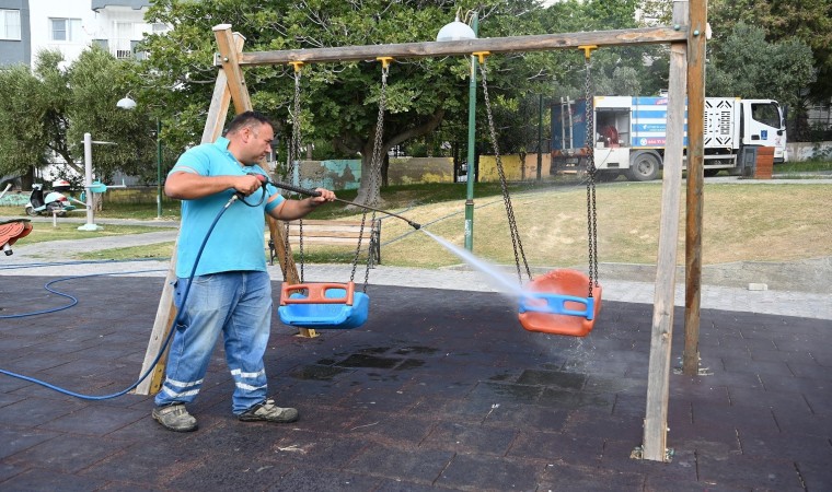 Kuşadası Belediyesi Temizlik İşleri Müdürlüğü ekipleri, parklar, yeşil alanlar ve meydanlar gibi kent sakinleri tarafından sıklıkla kullanılan kamuya açık alanlarda detaylı temizlik çalışması gerçekleştirdi. Yeni haftaya Türkmen ve İkiçeşmelik mahallelerinde bulunan parkları hijyenik hale getirerek başlayan ekipler, oyun ve oturma grupları ile spor alanlarını çevreye zarar vermeyen deterjanlar kullanarak dezenfekte etti. Park ve yeşil alanları köşe bucak temizleyen ekipler, yer altı ve yer üstü çöp konteynerlerini de köpüklü suyla yıkayarak kir ve kokudan arındırdı. Temizlik İşleri Müdürlüğü ekipleri detaylı temizlik mesaisine belirlenen program dahilinde devam edecek.