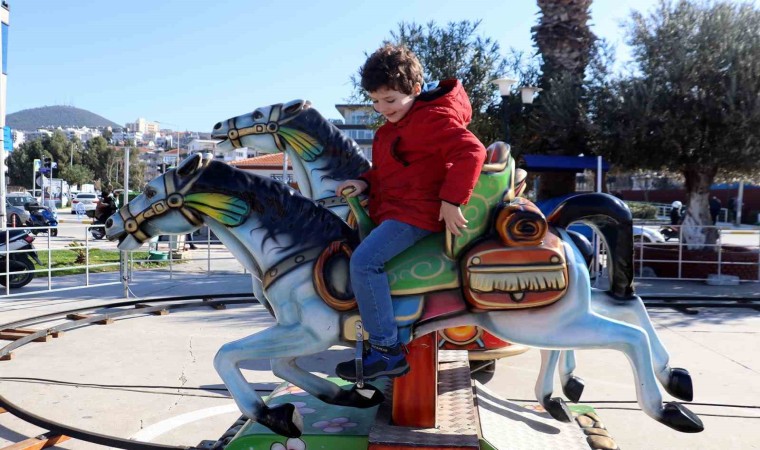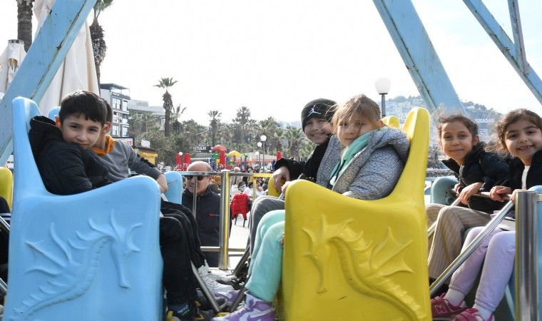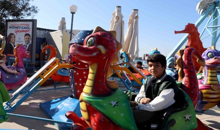 Kuşadası’nda yarıyıl tatilinde karne almanın heyecanını yaşayan çocuklar, İsmail Cem Dostluk ve Barış Meydanı’nda Kuşadası Belediyesi tarafından kurulan lunapark oyuncaklarıyla doyasıya eğleniyor. Güneşli havayı fırsat bilerek aileleriyle birlikte alana gelen çocuklar, keyifli oyuncaklar aracılığıyla sosyalleşme imkanı da buluyor.