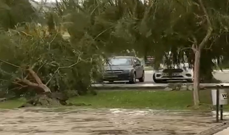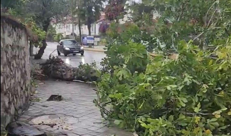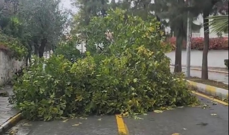 Aydın’ın Kuşadası ilçesinde sağanak yağış ile birlikte etkili olan kuvvetli rüzgar ağaçları devirdi.