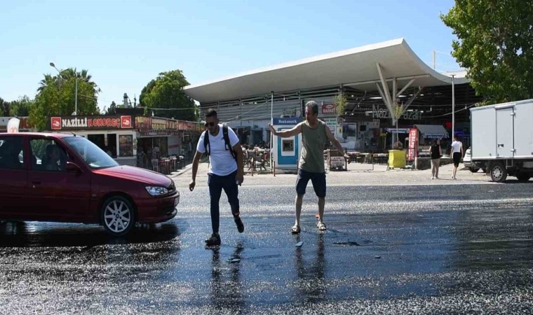 Meteoroloji Genel Müdürlüğü tarafından yapılan ‘aşırı sıcak’ uyarısının ardından Aydın’ın Kuşadası ilçesinde hava sıcaklığı 44 dereceye kadar yükseldi. Yaşanan aşırı sıcakla birlikte Karayolları’nın Nazilli Pazarı yolu, Davutlar ve Güzelçamlı yoluna yaptığı asfalt erirken, vatandaşların terlikleri asfalta yapıştı.